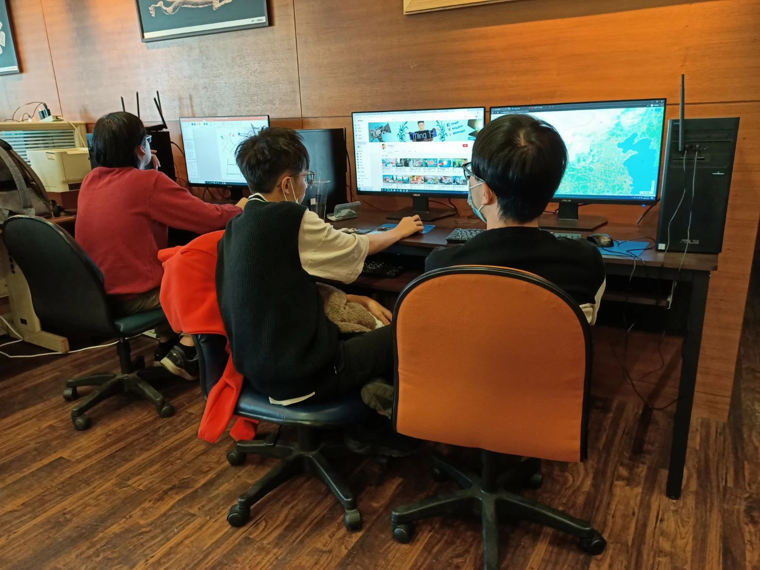 「圖文編輯理論與實務」修課學生使用智慧人本研究中心設備討論作業。