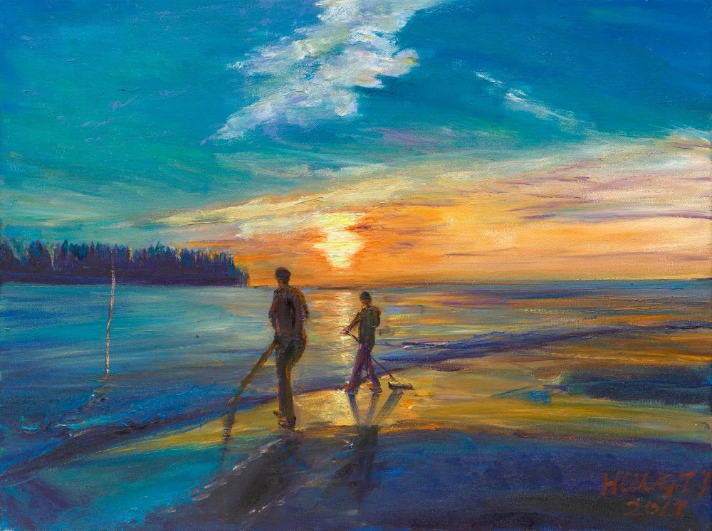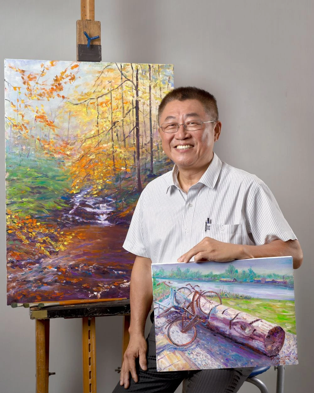 說起油畫創作的心路歷程,洪學長認為「油畫對我來說不僅是別於攝影的快速成像紀錄,也是人生的藝術哲學,更是一場心靈修行,透過畫筆的色彩揮灑、畫刀的刻痕表現,油顏料的層層堆疊,將這些年到台灣各地與世界各國旅遊,烙印在我腦海深處的美好風景與獨特回憶,更深遠的將這份感動保存,在作畫的過程中,經過慢條斯理的步驟,一點一滴注入情感,重新詮釋當時情境、心境、光影變化,彷彿回到當時的每一刻。」洪學長的油畫是屬於現代印象派的畫法。談起繪畫洪學長能滔滔不絕的講述關於繪畫的歷史以及心得。可見對於繪畫的投入與喜愛。