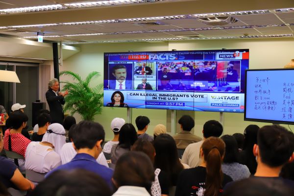 美國選舉開票當日,高承恕董事長與同學分析講解選情。