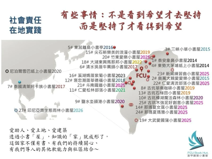 逢甲小書屋,是由逢甲大學建築系師生與眾多志工共同推動的公益計畫。多年來,他們走進台灣的偏鄉,為孩子們建造一間又一間屬於社區的書屋。這些書屋不像我們印象中典型的圖書館或學習中心,而是融合了當地環境、文化與需求所量身打造的空間。每一間小書屋,都是一份真誠的回應、一段與土地深切連結的溫暖故事。