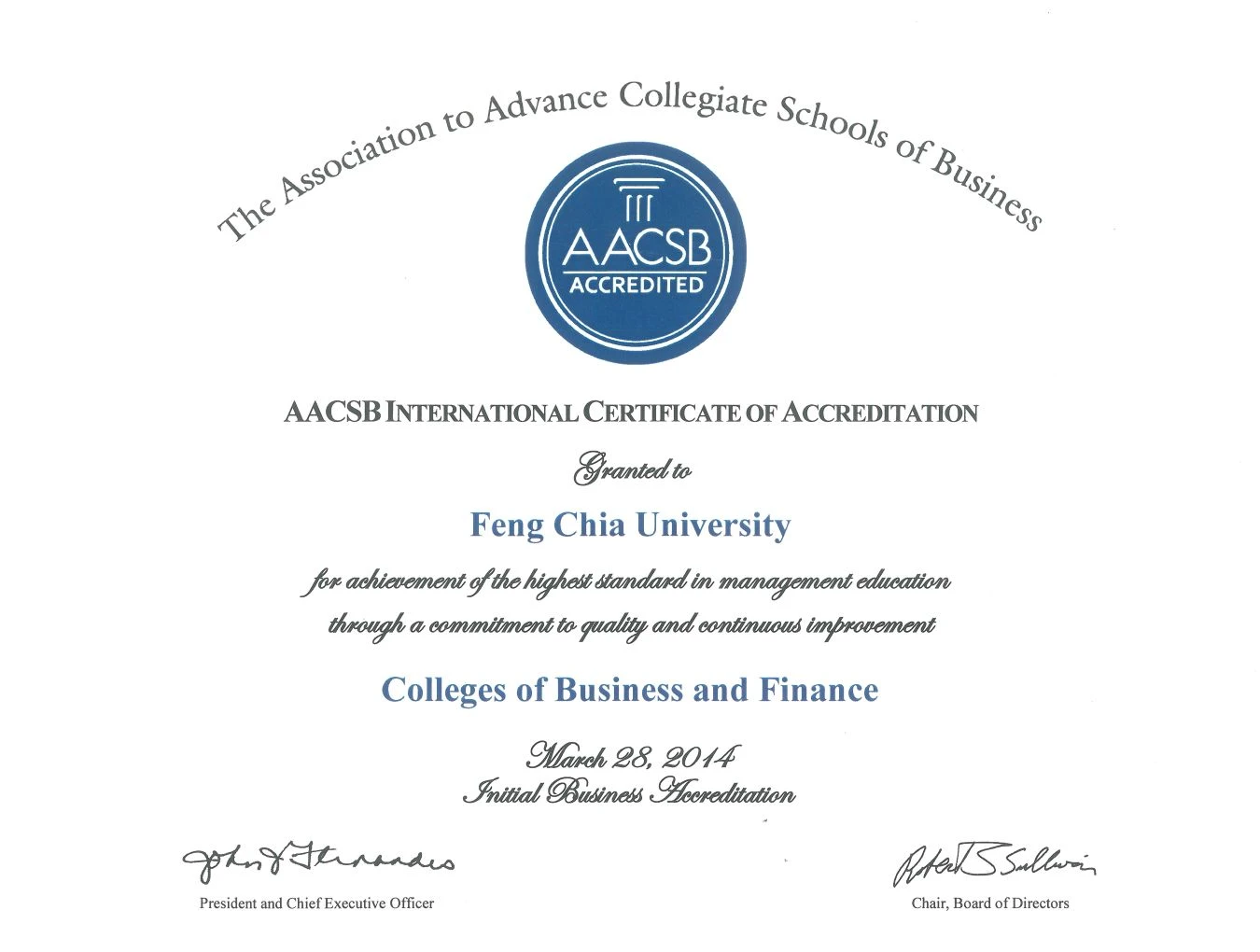 母校為提升教學品質,並與國外著名大學並駕齊驅,於民國95年申請加入AACSB成為會員。歷經數任院長們的努力,於民國103年2月在王葳前院長(現任教務長)的帶領之下,商學院、金融學院、EMBA順利通過國際商管學院促進協會(The Association to Advance Collegiate Schools of Business,AACSB)認證,成為台灣第9所、中部第一所獲得AACSB認證的學校,預計民國107年11月下旬接受每5年的「持續進步評鑑」,實地訪評小組也將到校訪視。