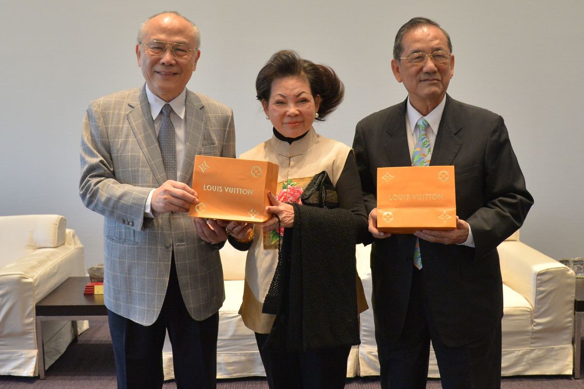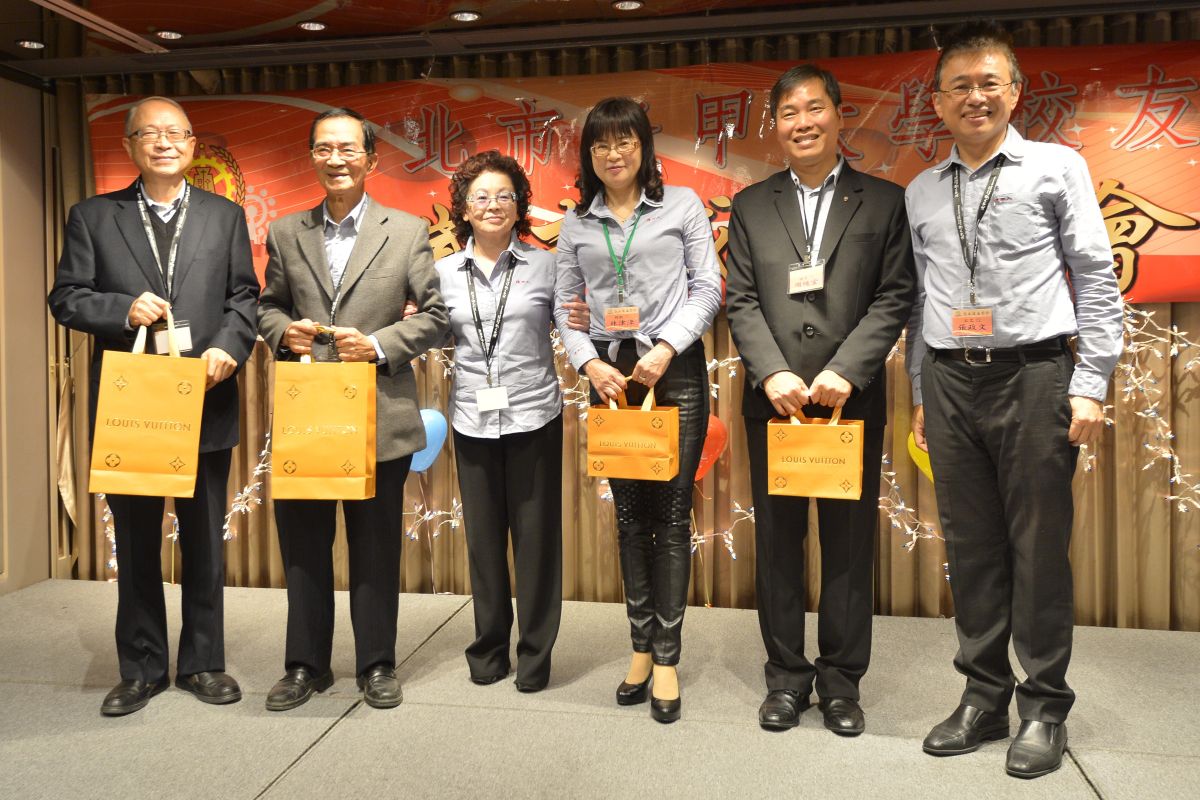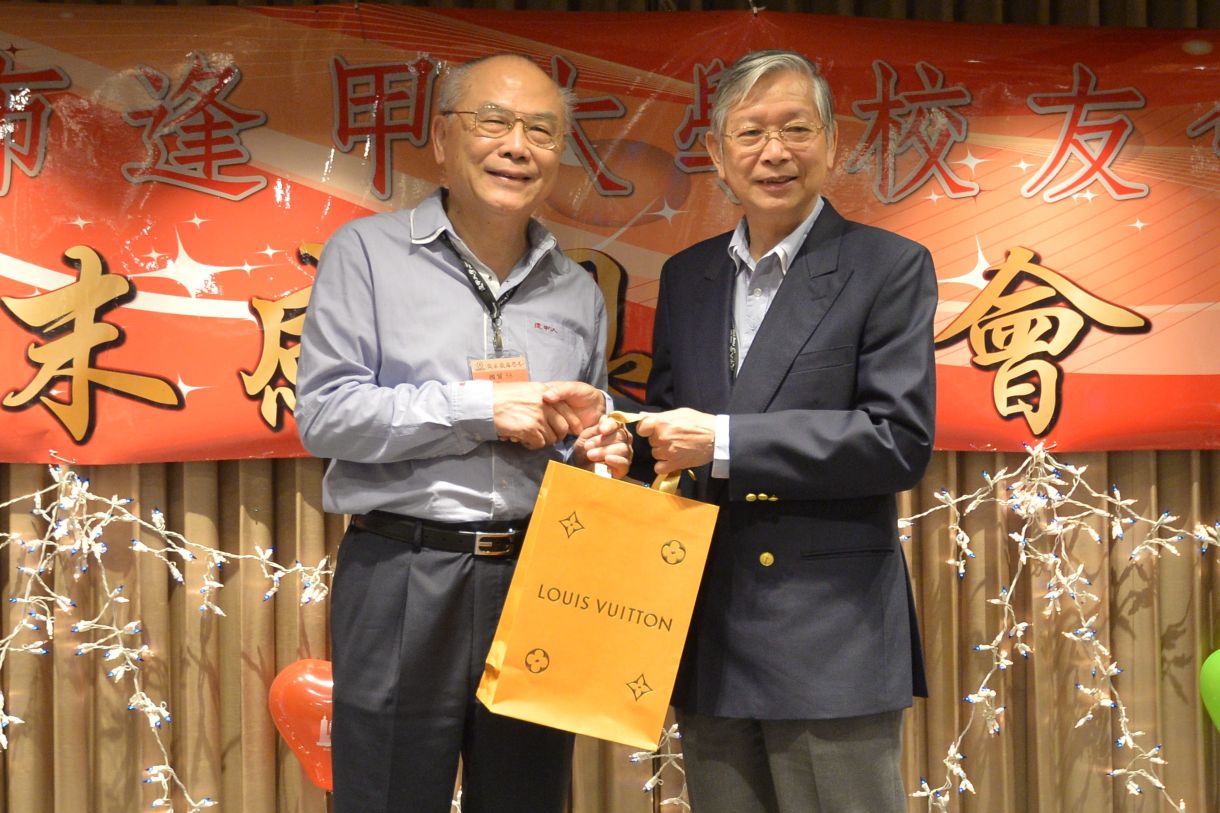 席間,由郭學姊致贈禮品給資深傑出貢獻獎,首先頒發楊龍士副校長感謝他在母校30多年的付出,楊副校長在從民國76年就進入母校,且擔任副校長10多年的時間,是新校地建置的重要推手,母校謝振裕董事說:「楊副校長是個沒有聲音,但是做很多事的人」,楊副校長雖默默付出,但是他的辛勞及用心大家都感受得到,也看得到,頒給楊副校長這個獎項可說再貼切不過;台中市副市長林陵三學長(水利57),是水利界的優秀人才,連雪山隧道也是他所規畫建置的,今日林學長雖有公務無法前來與會,但他為台灣本土盡心盡力,積極回饋母校及水利系,並提攜了校友無數,今年更榮獲了水利系傑出貢獻獎,是逢甲人的楷模!今日致贈資深貢獻獎予林學長伉儷,當之無愧!
