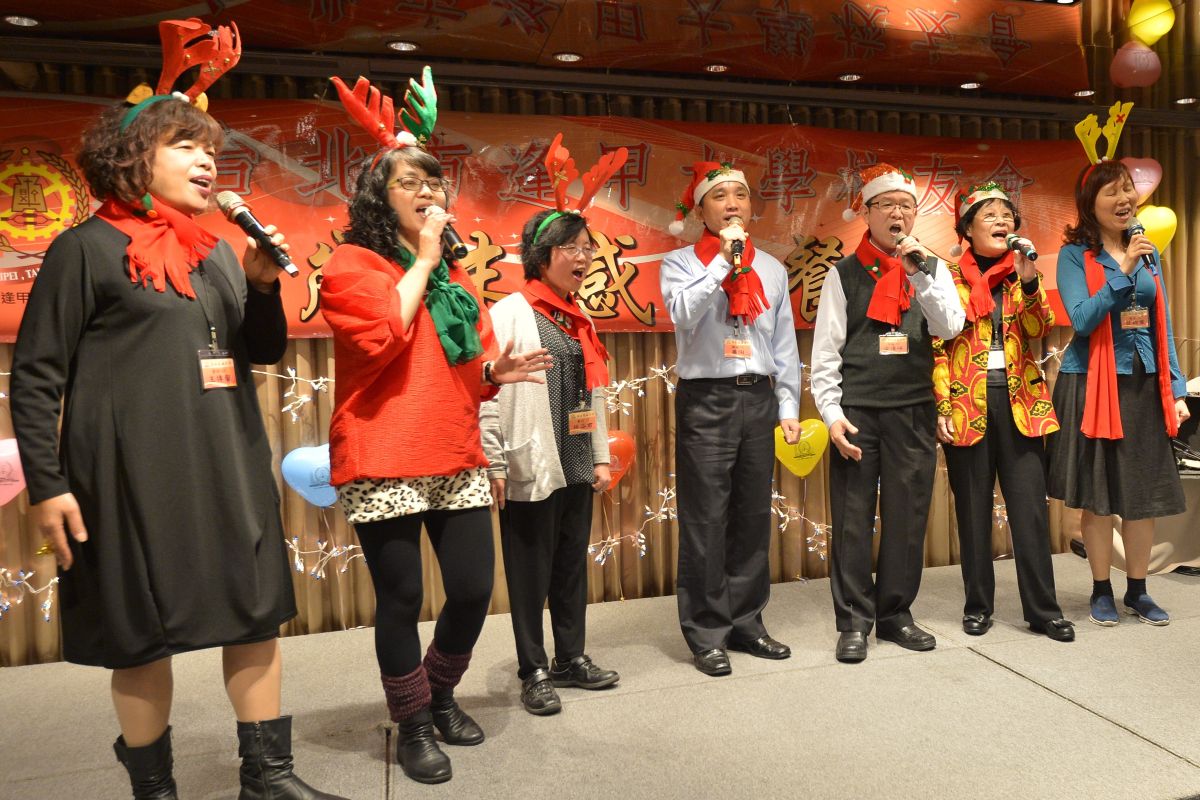 逢友合唱團一行人7位學長姊穿上可愛的聖誕服飾,上台演唱經典的聖誕歌曲「Jingle bells」及「平安夜」,高亢優美的聲音,現場頓時充滿著歡樂的聖誕氣氛,基金會徐正冠董事長特邀請逢友合唱團一同合唱「初戀女」,氣氛飆到最高點,熱鬧不已!