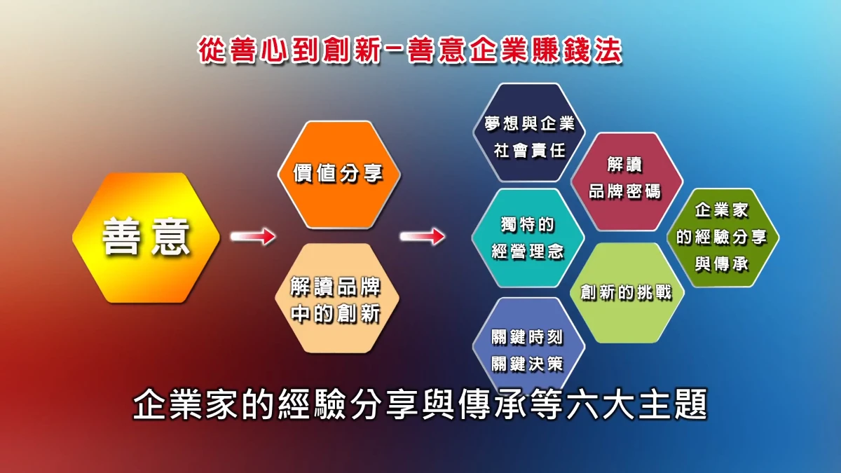 「從善心到創新-善意企業賺錢法」的課程設計以「善意」為核心主軸,依6週課程規劃出夢想與企業社會責任、獨特的經營理念、關鍵時刻關鍵決策、解讀品牌密碼、創新的挑戰、企業家精神的傳承與傳遞等6大單元。