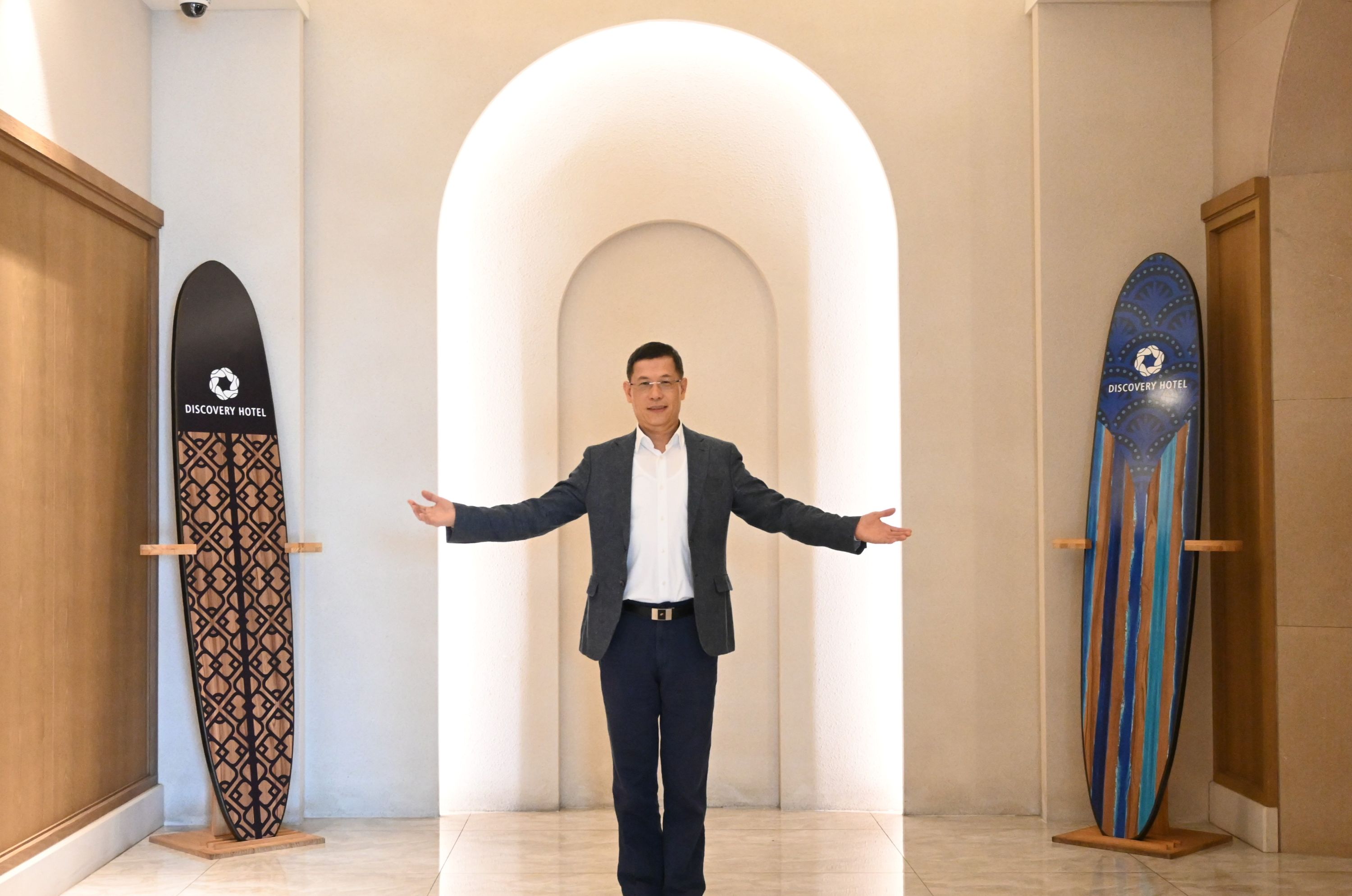 走進澎澄飯店(Discovery Hotel),陽光從挑高大廳灑落,映照在結合海浪、魚群與天人菊意象的鐵件裝飾上,第一眼便能感受到這座飯店與澎湖土地緊密相連的情感與美學。「當初我們每個月來澎湖,不只是看工程進度,更重要的是帶著設計團隊和高層一站站拜訪、理解澎湖的文化與故事,讓飯店從建築語彙到空間體驗,都能和這片土地對話。」江學長與飯店楊智超副總回憶2015年籌建初期,團隊為從澎湖元素汲取靈感,幾乎每次開會後便深度遊覽澎湖。從閩南窗花延伸的拱門設計、象徵西嶼古堡的電梯牆面圓孔,到可眺望日出與煙火的落地玻璃與陽台,澎澄飯店的每一處細節,皆蘊藏著對澎湖歷史與風景的致敬。