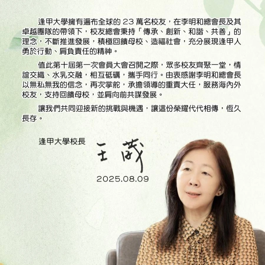 李明和總會長以高票連任理事長,贏得海內外校友的高度肯定與信任。高承恕董事長讚許他「用心給力、無私奉獻」,肯定其領導風範與不懈付出;施鵬賢總會長則幽默地說:「做得這麼好的總會長,我們怎麼捨得讓他離開?」來自馬來西亞的逢甲大學校友會在賀詞中表示:「在全體校友的信賴與支持下,再度由李明和總會長掌舵領航。」中國大陸校友會也滿懷敬意與喜悅,向他送上最誠摯的祝賀。這份殊榮,不僅代表榮譽的加冕,更意味著沉甸甸的使命與責任。