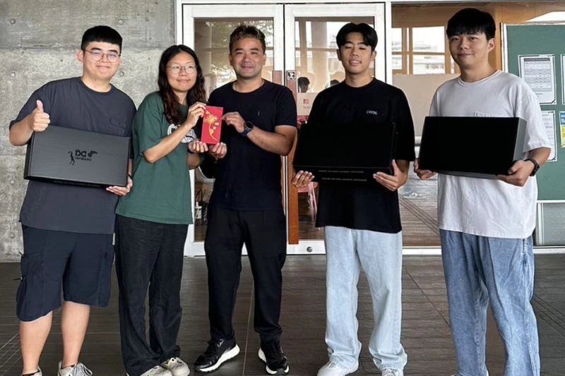 馬克生活有限公司旗下的INFMARC執行長蔡世譯(中),特別蒞校贈送匹克球拍與獎勵學金給四位航太系同學。