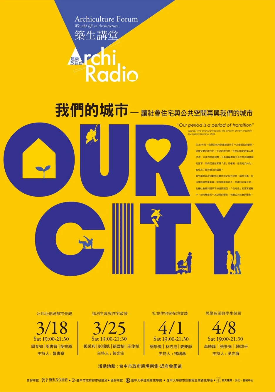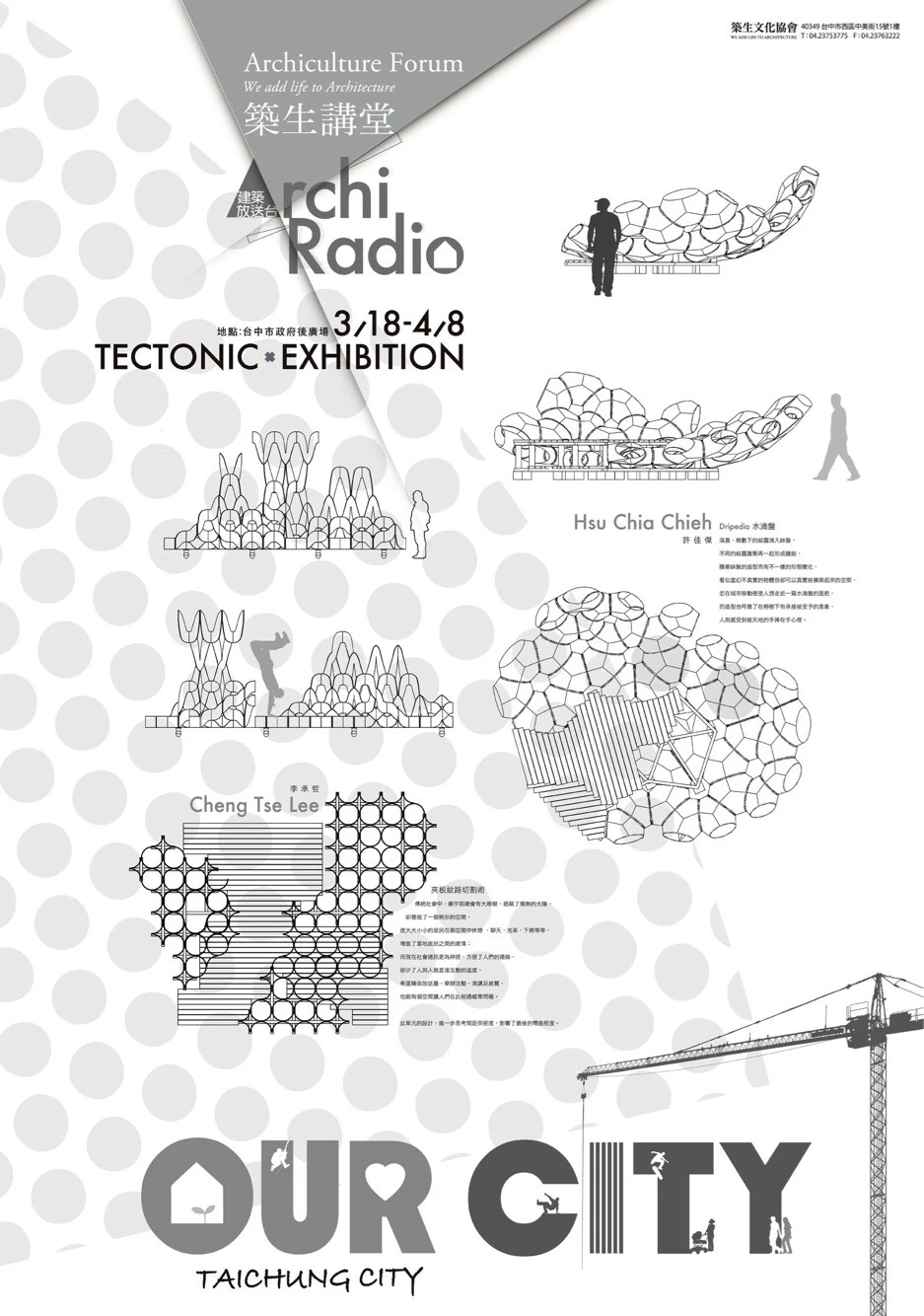 本次「建築放送台」是建築專業學院沈揚庭老師統籌搭配建設學院都資系及築生講堂三方合作,以推動建築、藝術、生活美學之普及化教育為目標,致力提升大眾共同的文化美學價值,並建立終身學習的管道,營造一個空間與心靈皆美的社會環境。「放送台」以CDIO創新教育模式將3R(Real Project、Real Design and Real Company)融入數位實構課程,目標是「社會實踐×邁向市府×面向人民」,引導學生設計戶外行動講台,並將決選出的兩座作品於台中市府前廣場展出,並在此舉辦了4場演講,讓學生執行的專案實際應用在都市場域中。數位實構課程目標在於希望學校教育能夠接軌真實社會,讓學生的創意能結合社會脈動。