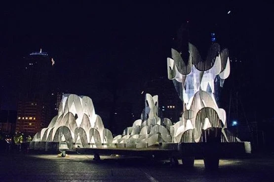台中市政府前廣場展示數位實構1:1實體作品「伴風間與Drip」。
