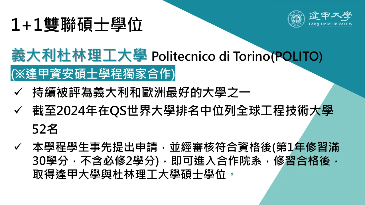 另一大亮點,是回應逢甲大學國際化學習目標,與義大利杜林理工大學合作的1+1雙聯碩士學位。學生完成第一年課程後,第二年前往杜林理工修業,達成雙方規定即可同時取得兩校碩士學位。